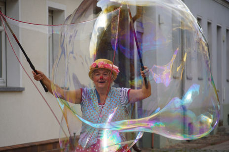 Viele kleine Seifenblasen, riesengroße Seifenblasen, Kind in der Seifenblase, alle machen mit, später auch Indoor Seifenblasen.